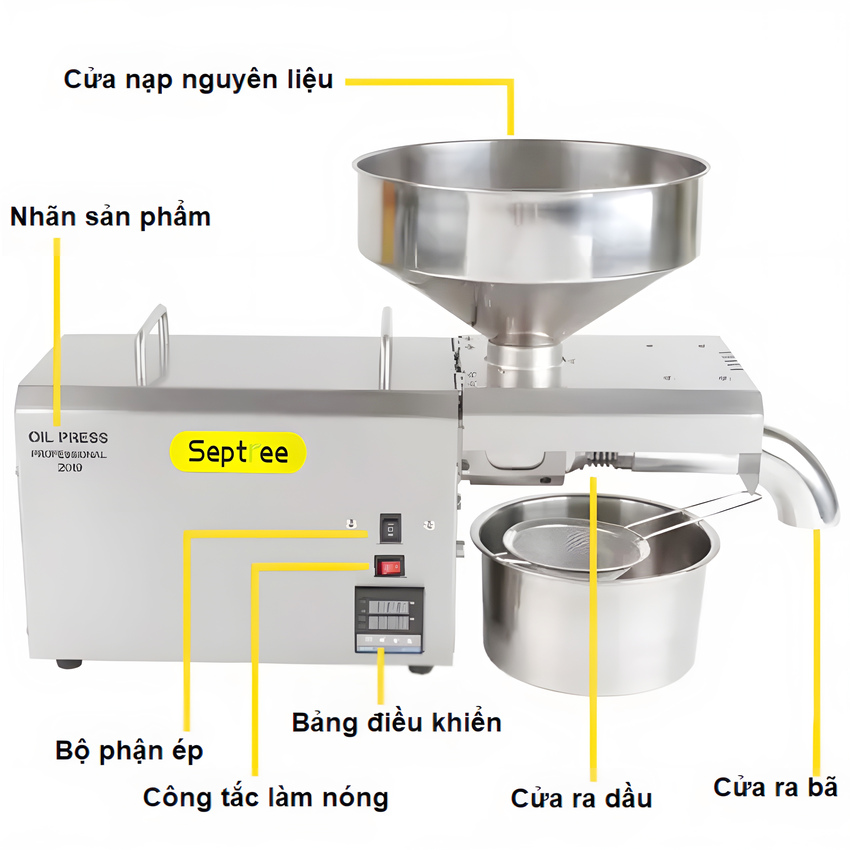 Máy ép dầu thực vật công nghiệp Septree S8 với tính năng ưu việt, giúp bạn tự tay mình làm ra những chai dầu vàng óng, nguyên chất 100% từ những nguyên liệu hữu cơ: Lạc (đậu phộng), vừng (mè), dừa, hướng dương, đậu nành,… Máy ép dầu Septree S8 là sản phẩm được các đầu bếp lựa chọn nhiều nhất hiện nay, bởi tính năng mang lại cho người sử nguồn thực phẩm sạch, an toàn cho sức khỏe.
