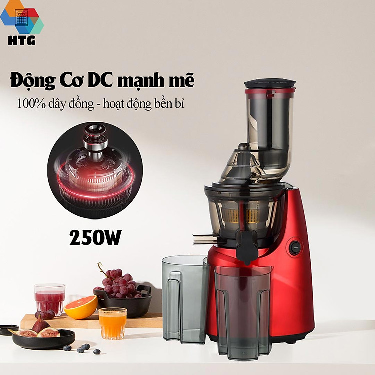 - Trang bị động cơ motor DC công suất 250W với dây đồng Nguyên Chất, giúp trục nghiền ép thực phẩm rất mạnh mẽ, không sợ bị tắc khi ép các loại quả cứng, hay nhiều chất xơ.