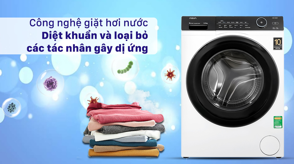 Máy giặt Aqua này còn sở hữu công nghệ giặt hơi nước, giúp cho quần áo được diệt khuẩn tối ưu cũng như loại bỏ hầu hết những tác nhân gây dị ứng còn bám trên đồ và giảm thiểu mức độ nhăn của quần áo sau khi giặt