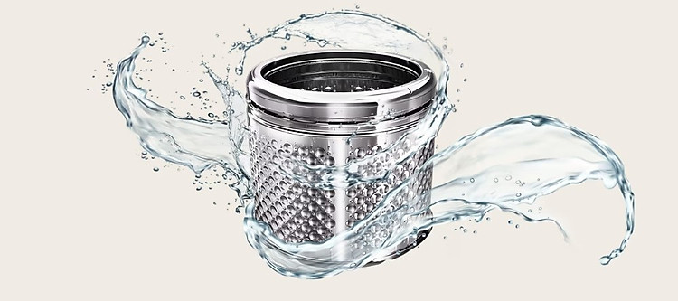 Lồng giặt được làm từ thép không gỉ, có bề mặt sáng bóng, độ bền cao và khả năng chống ăn mòn hiệu quả, đặc biệt phù hợp trong môi trường thường xuyên tiếp xúc với hóa chất tẩy rửa.