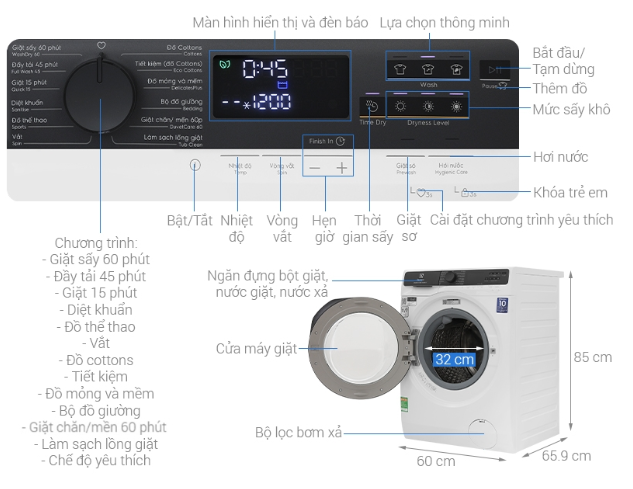 Bảng điều khiển | Thêm quần áo khi máy đang giặt Sấy trên mức độ khô mong muốn Sấy dựa trên thời gian mong muốn Lưu chương trình yêu thích Khóa trẻ em Hẹn giờ giặt kết thúc Giặt sơ Chỉnh số vòng vắt Chỉnh nhiệt độ nước Hygienic Care - Diệt khuẩn sau mỗi lần giặt Tùy chọn mức độ bẩn của quần áo |