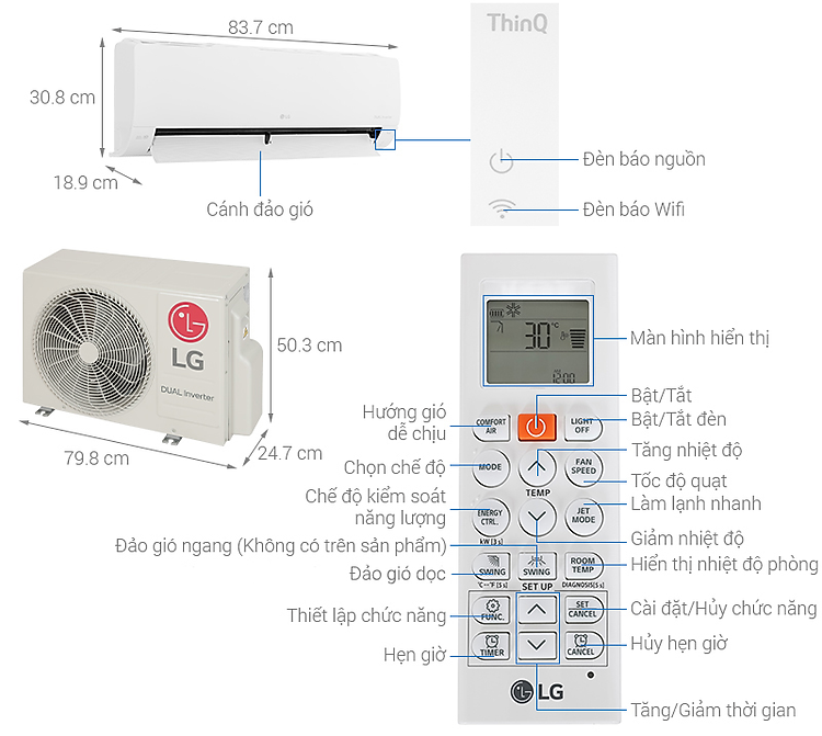 - Kích thước - Khối lượng dàn lạnh:Dài 83.7 cm - Cao 30.8 cm - Dày 18.9 cm - Nặng 8.2 kg