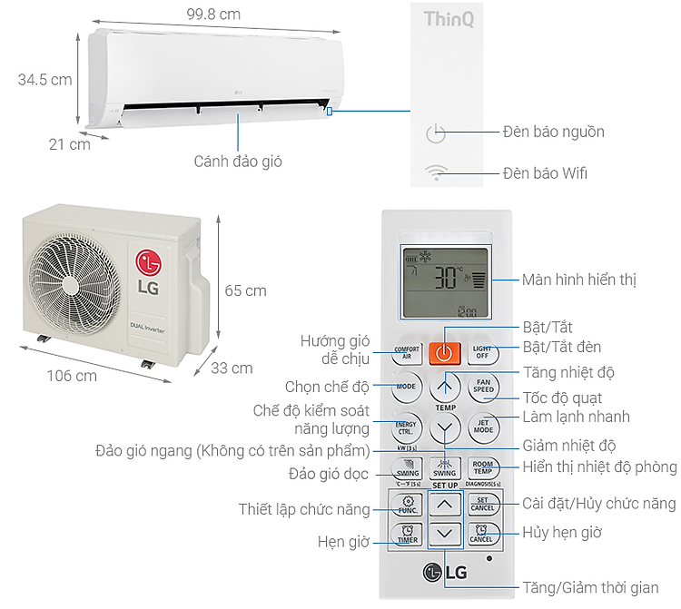 - Kích thước - Khối lượng dàn lạnh:Dài 99.8 cm - Cao 34.5 cm - Dày 21 cm - Nặng 10.8 kg