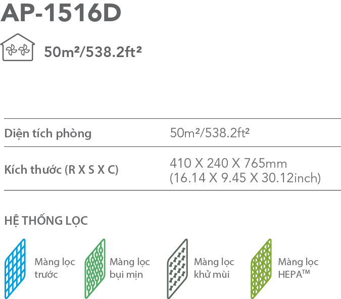 Bộ màng lọc: Gồm 04 lớp màng lọc: Màng lọc trước, Màng lọc trung gian A2, Màng lọc khử mùi, Màng lọc HEPA để xử lý các tác nhân ô nhiễm (bụi bẩn, mùi hôi, khói, vi khuẩn, phấn hoa, nấm mốc…)