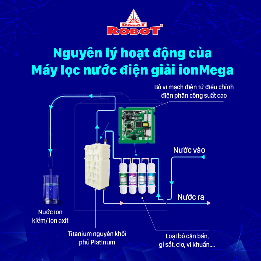 Ứng dụng công nghệ điện giải tiên tiến chuẩn quốc tế, Máy lọc nước điện giải ion kiềm ROBOT ionMega 117 có 2 bộ phận chính quan trọng nhất là Bộ điện phân và Hệ thống lọc đều được sản xuất tại Hàn Quốc.