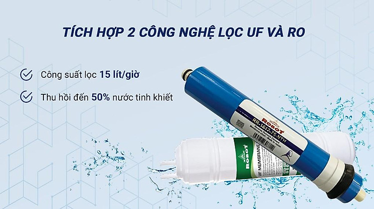 - Tích hợp 2 công nghệ lọc tiên tiến UF và RO đảm bảo tuyệt đối chất lượng nước đầu vào, an toàn cho sức khỏe, tăng tuổi thọ và tiết kiệm gấp đôi chi phí thay màng RO cho người dùng.