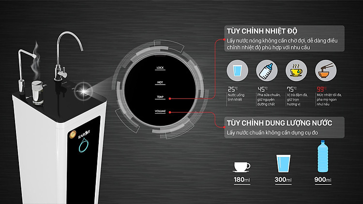 Tiết kiệm thời gian chờ đợi đun nước, tiết kiệm chi phí điện, cung cấp được nước nóng ở chính xác mức nhiệt và thể tích mong muốn, giải pháp thông minh cho các nhu cầu nước ấm, nước nóng, pha sữa, pha trà, cafe, khử trùng, nấu nướ