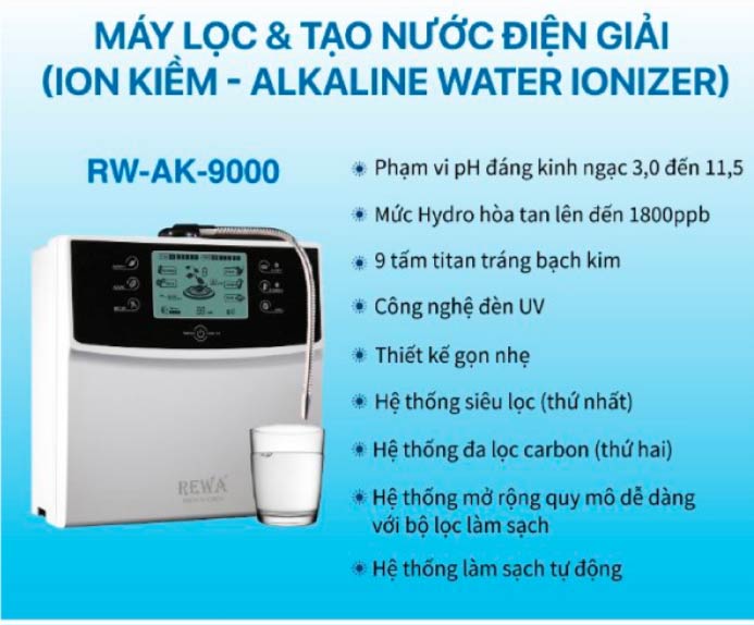 Máy lọc và tạo nước Ankaline Hydro Kiềm RW-AK-9000 mang đến nhiều ưu điểm nổi bật, giúp cải thiện chất lượng nước uống và chăm sóc sức khỏe một cách tối ưu. Hãy cùng tìm hiểu những ưu điểm đáng kinh ngạc của sản phẩm này: