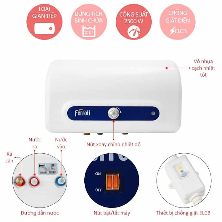 Bình tắm nóng gián tiếp Ferroli QQ AE 20 lít là một sản phẩm sở hữu hầu hết các tính năng tiêu chuẩn của một máy nước nóng gia đình. Với cơ chế sử dụng dễ dàng, nút điều chỉnh nhiệt độ được tích hợp trực tiếp trên vỏ máy, thiết kế ở vị trí chính diện vừa tầm với, dễ điều chỉnh. Bình tắm nóng gián tiếp Ferroli QQ AE có dung tích lưu trữ lượng nước nóng lên tới cho bạn thoải mái sử dụng.