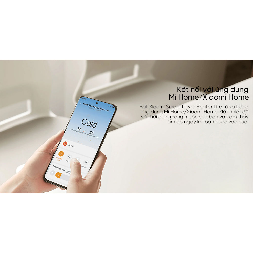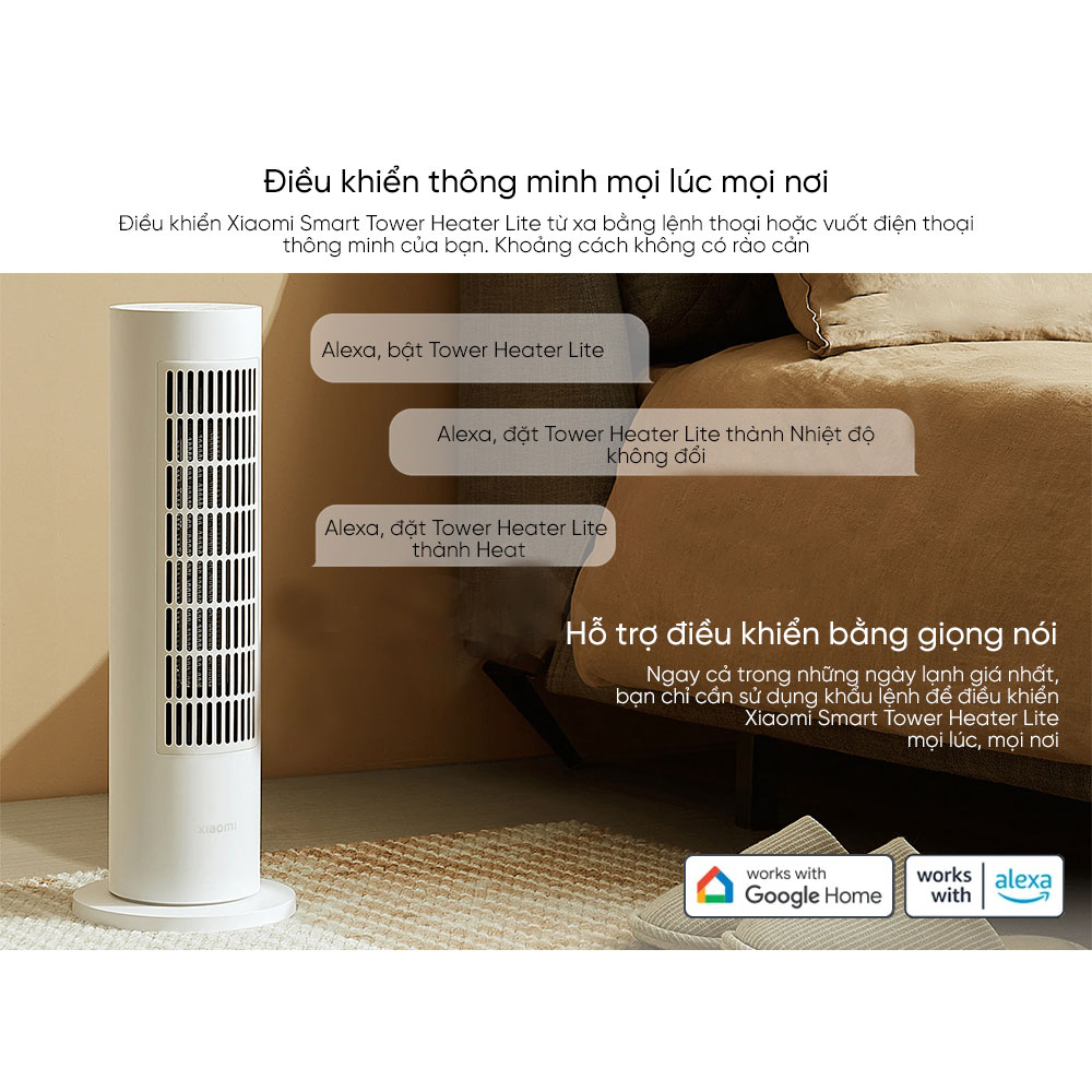 Bạn dùng có thể điều khiển  từ xa trên điện thoại thông minh qua giọng nói hoặc kết nối ứng dụng Mi Home. Máy sưởi thông minh Smart Tower Heater Lite hỗ trợ điều khiển bằng giọng nói, ngay cả trong những ngày lạnh giá nhất, bạn chỉ cần sử dụng khẩu lệnh để điều khiển máy sưởi mọi lúc, mọi nơi.