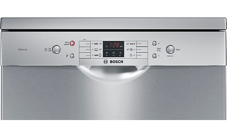 Các lồng rửa của Bosch SMS63L08EA được làm bằng thép không gỉ, thuận tiện cho việc xếp bát dĩa Chức năng VarioSpeed làm giảm thời lượng rửa đến gần một nửa mà không cần phải bỏ qua bất kì công đoạn nào. Máy được dán nhãn năng lượng A+ theo thang đánh giá châu Âu. Trong chương trình rửa ECo, thiết bị chỉ tiêu thụ 11,8 L nước và 1.02kWh / chu trình rửa. Điều khiến nút bấm kết hợp màn hình hiển thị điện tử sắc nét. Bảng điều khiển của máy rửa bát Bosch SMS63L08EA Tính năng an toàn: khóa trẻ em, khóa cửa