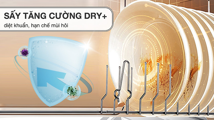 - Chức năng sấy tăng cường Dry+: Sử dụng nhiệt độ cao 72°C để sấy khô, nhờ đó diệt được vi khuẩn tối ưu, đồng thời loại bỏ mùi hôi bám trên chén bát, đũa muỗng và xoong nồi đáng kể.