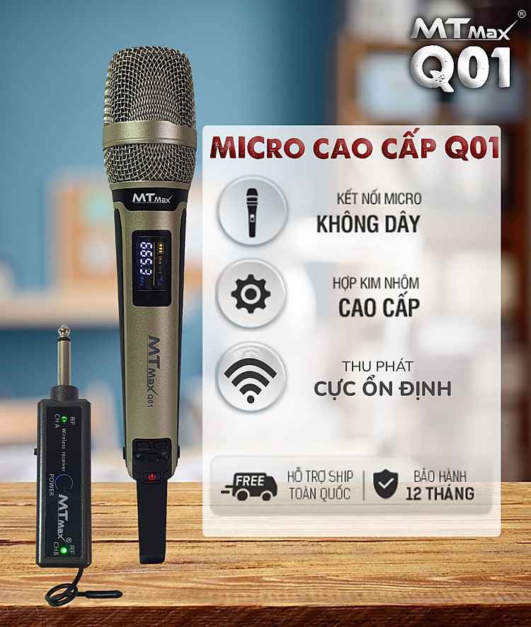 Để hát Karaoke thả ga, một chiếc micro hiện đại, tiện nghi, cho chất giọng hay là không thể thiếu. Dòng micro không dây MTMAX Q01, kết nối không dây đơn giản, nhanh chóng, đầu thu sử dụng pin sạc dung lượng lớn đảm bảo hoạt động bền bỉ, hát thả ga mà không cần sạc quá nhiều lần. Micro hát Karaoke MTMAX Q01 là dòng sản phẩm cao cấp hiện nay mà bất cứ gia đình, quán hát hay các cuộc vui chơi không thể thiếu.