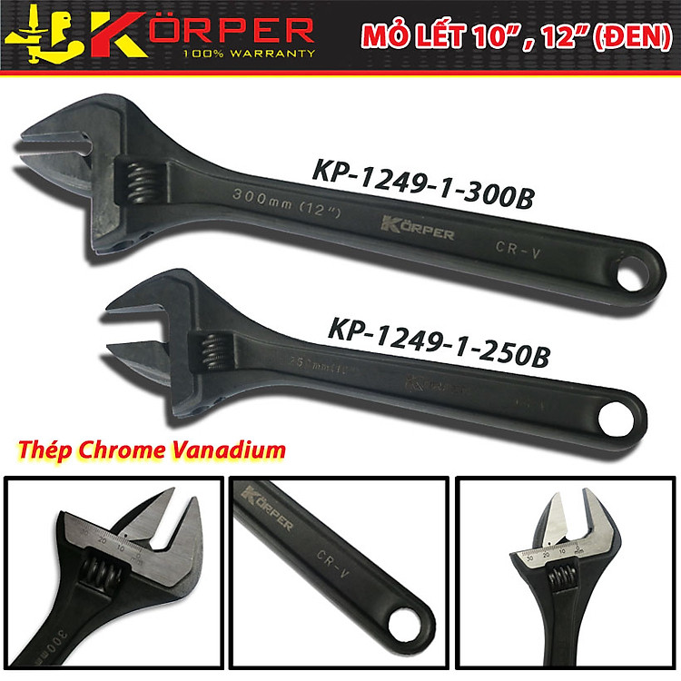 - Mỏ Lết Körper KP-1249-1-250B được làm từ chất liệu thép CRV cứng cao cấp, quai hàm được tôi luyện chắc rắn, răng ma sát của mỏ lết được thiết kế đặc dày có tác dụng chống trượt khi tháo, lắp các chi tiết.