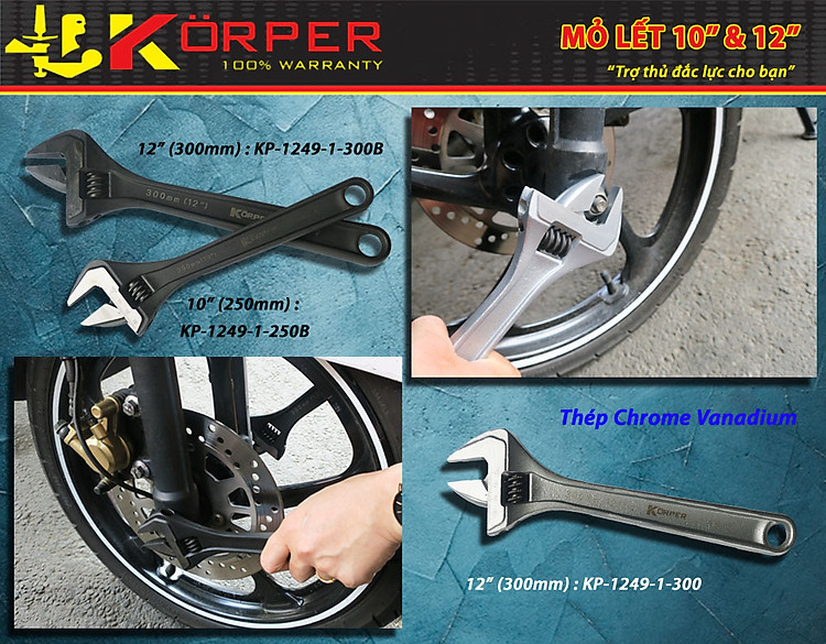 - Khi sở hữu sản phẩm, bạn có thể điều chỉnh được kích cỡ của mỏ lết để phù hợp với nhiều kích cỡ đai ốc khác nhau. Mỏ lết Körper sẽ giúp bạn hoàn thành những công việc tưởng chừng như rất khó khăn đó một cách nhanh chóng và nhẹ nhàng hơn bao giờ hết.Hãy bổ sung ngay sản phẩm vào hộp đồ nghề sửa chữa của gia đình bạn để phục vụ công việc một cách tốt nhất.