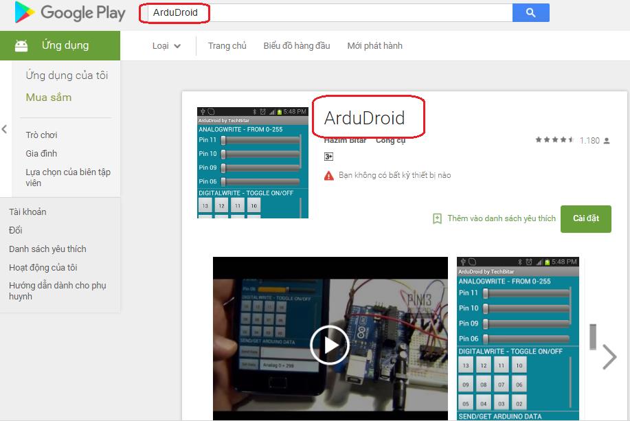 Vào Google Play gõ ArduDroid và tiến hành cài đặt: