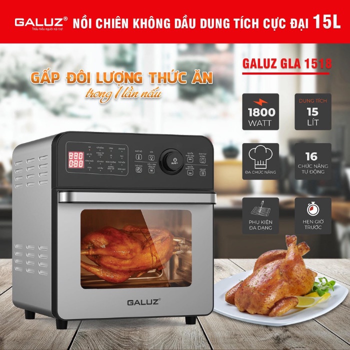 Giới thiệu Nồi chiên không dầu Galuz GLA 1518 thương hiệu Pháp dung tích 15L lớn để được nhiều đồ ăn có 16 Chức Năng nấu ăn cao cấp