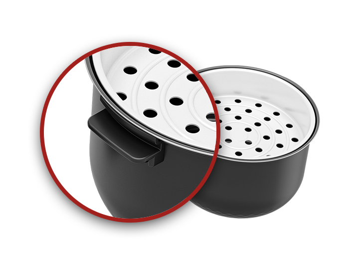 Thực phẩm ít bám dính nên dễ dàng vệ sinh. Nhiệt được phân bổ hiệu quả khắp nồi giúp cơm chín đều. Thiết kế này cũng giúp gia tăng tăng độ bền nhờ khả năng chống trầy xước.