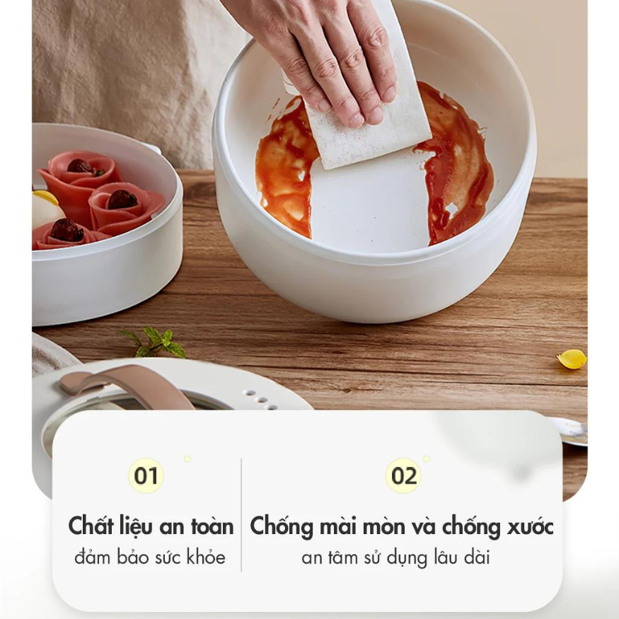 Nồi điện đa năng Bear DRG-E15F2 được làm từ chất liệu kim loại cao cấp, phủ lớp men trắng vừa có tác dụng chống bám bẩn, vừa tạo sự nhã nhặn của chiếc nồi. Bên trong lòng nồi phủ thêm lớp chống dính, người dùng hoàn toàn có thể yên tâm để chiếc nồi điện đa năng này giúp bạn thực hiện các món ngon cho gia đình mà không lo thức ăn bám lại trên nồi, khó vệ sinh. Chỉ cần tráng sơ với nước và dùng khăn sạch lau là đã xong việc vệ sinh cho thiết bị, sẵn sàng cho món tiếp theo.
