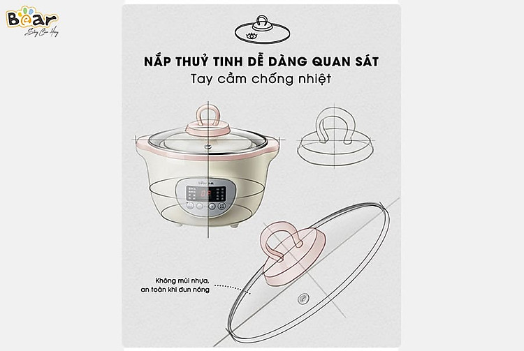 Ngoài nắp thố sứ thì Bear còn thiết kế kèm theo một em nắp thủy tinh phía bên ngoài giúp hạn chế tỏa nhiệt khi sử dụng. Thủy tinh trong giúp bạn dễ dàng theo dõi lượng nước còn lại trong nồi khi nấu. Tay cầm chống bỏng tiện lợi hơn khi di chuyển và sử dụng nồi nấu cháo Bear SUBE002.
