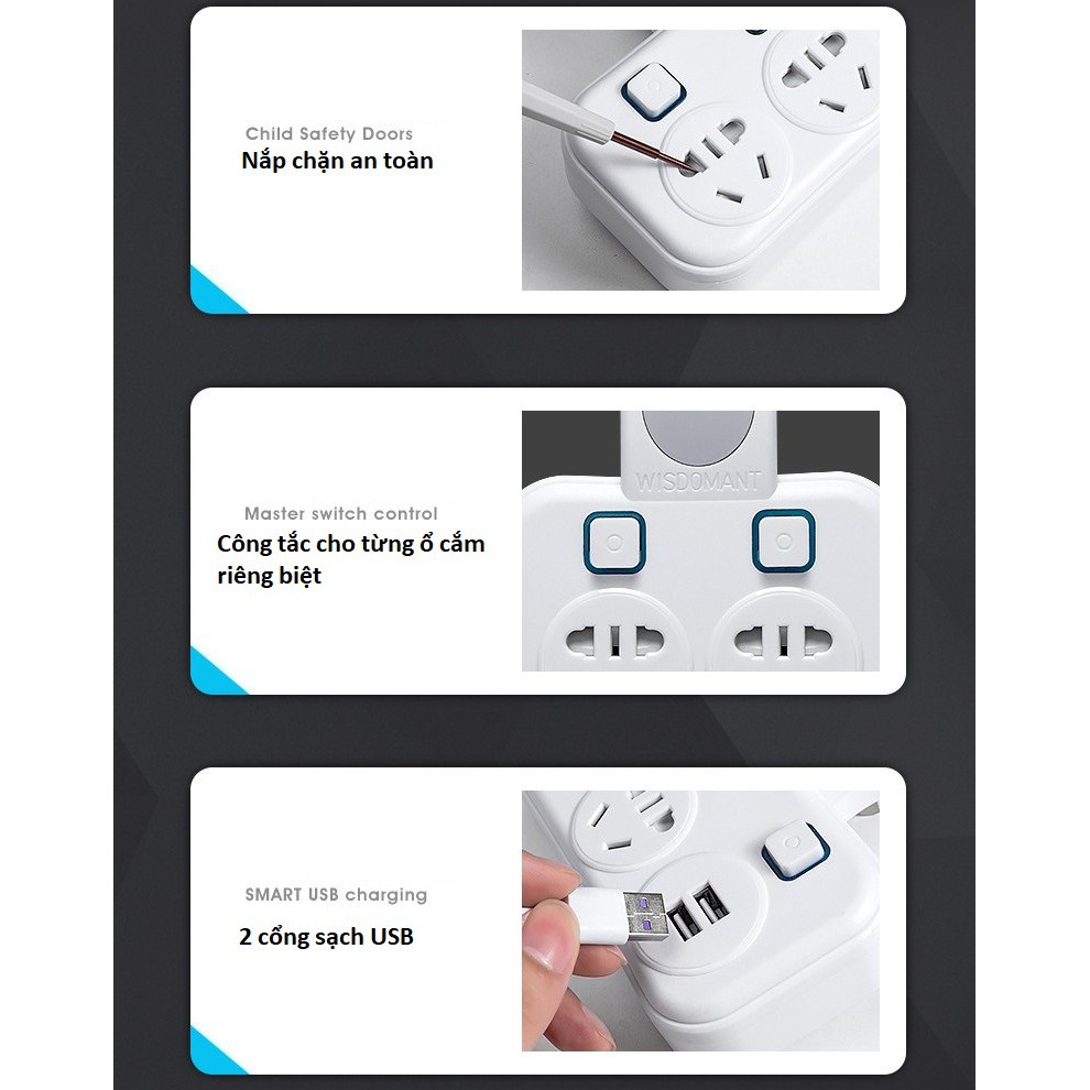 - Kếthợp 3 ổ cắm chuẩn quốc tế (sử dụng được nhiều đầu cắm của hầuhết các quốc gia trên thế giới) với 2 đầu sạc USB tạo sự thuận tiện, tiện lợi cho căn phòng của bạn.