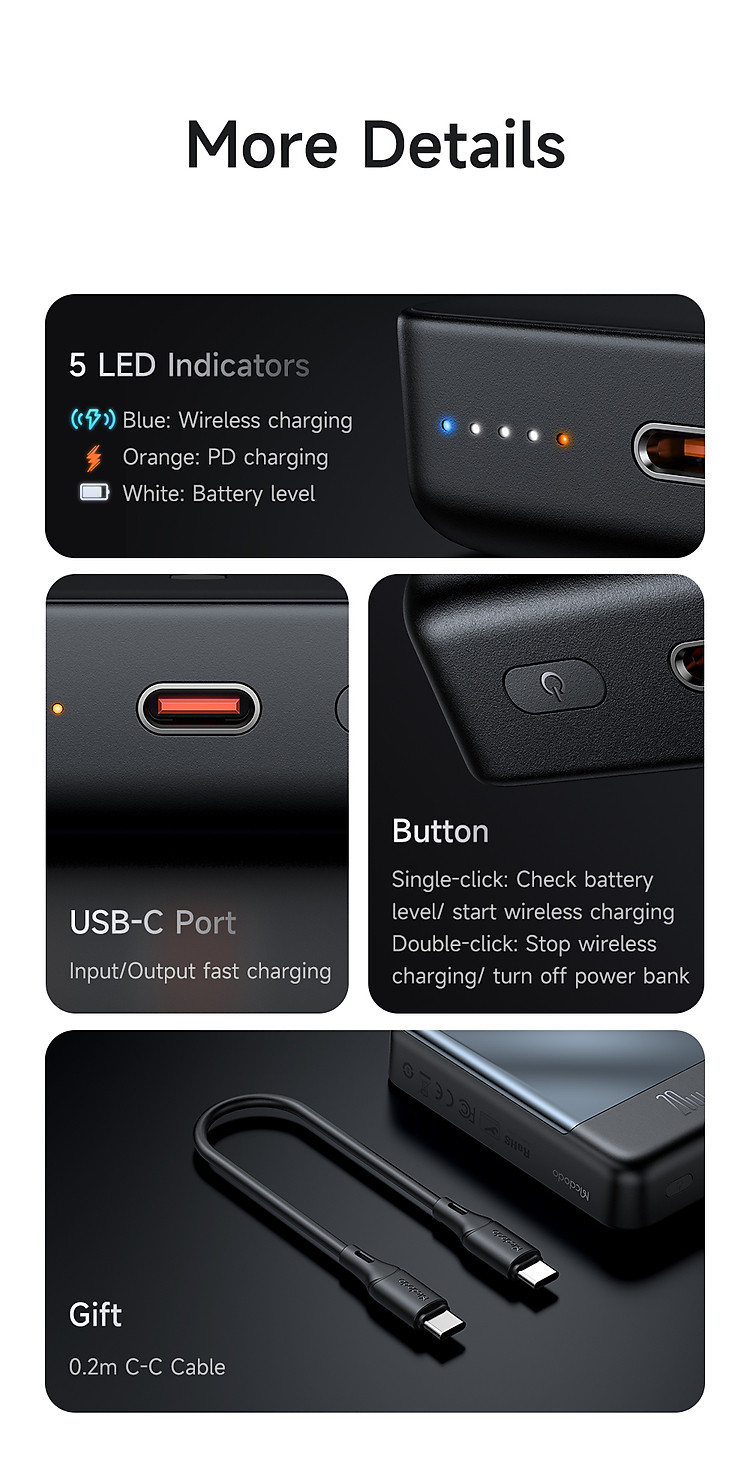 Sản phẩm này có công suất lớn lên đến 10000mAh, đảm bảo bạn không bao giờ phải lo lắng về việc hết pin giữa các hoạt động quan trọng. Nhờ tính năng sạc không dây Magnetic, bạn chỉ cần đặt điện thoại di động lên pin sạc và nó sẽ tự động bắt đầu sạc, loại bỏ bất kỳ sự phiền toái nào liên quan đến việc mắc dây cáp.