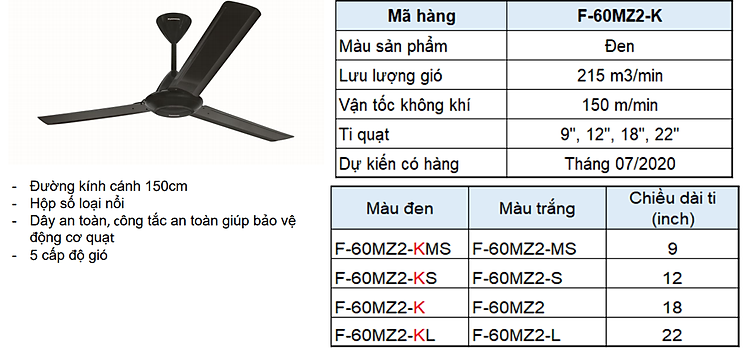 Nhằm đáp ứng nhu cầu của khách hàng, Panasonic cho ra dòng sản phẩm quạt trần 3 cánh F-60MZ2-KL với chiều dài ti lên tới 65cm thích hợp với những trần nhà từ 3m6 trở lên.