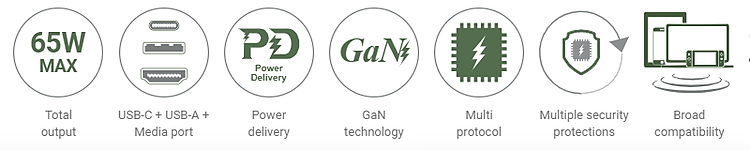 - 60W GaN + cổng media 4K / HD video + sạc, cắm và chạy (hỗ trợ máy tính xách tay, điện thoại di động, máy chơi game).