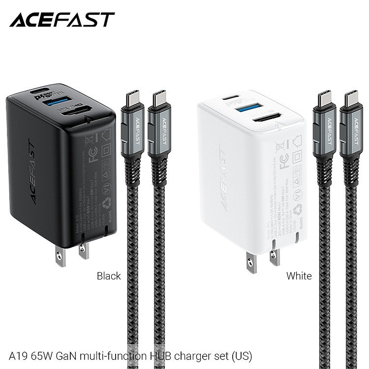 Sạc ACEFAST A19, cổng USB-C + USB-A + HUB 65W, phích cắm US.