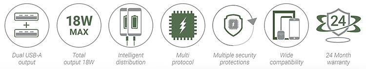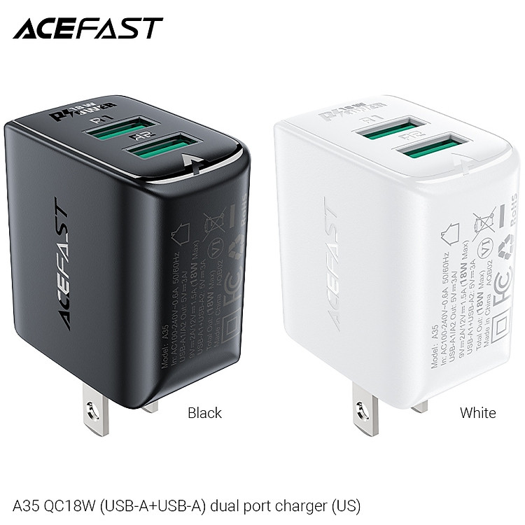 Sạc ACEFAST A35, 2 cổng USB-A QC18W, phích cắm US, hỗ trợ hầu hết các giao thức sạc nhanh.