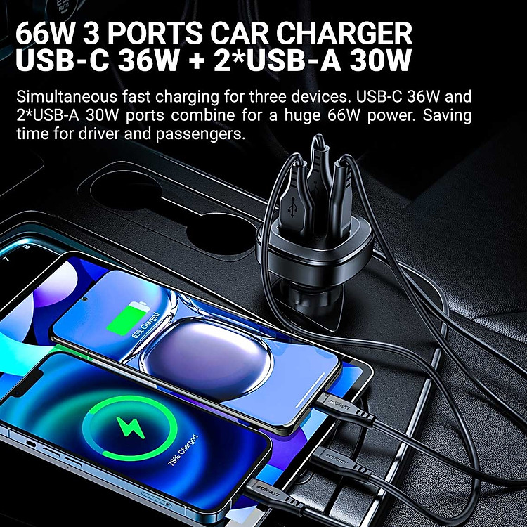 Sạc ô tô ACEFAST B9, tổng công suất 66W, vật liệu thân bằng hợp kim nhôm.