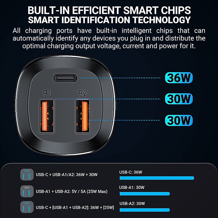 USB-C + USB-A1 / A2: 36W + 30W.