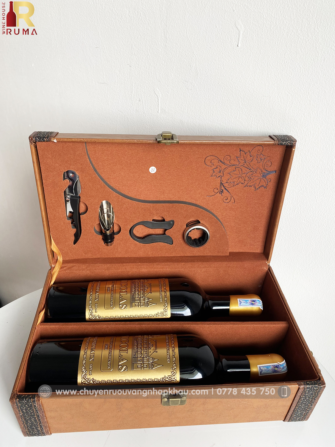 THÔNG TIN SET QUÀ TẶNG CAO CẤP 2 CHAI VANG PHÁP NICOLAS - HỘP DA PU KÈM BỘ PHỤ KIỆN