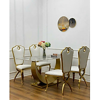 Bộ bàn ăn Juno Sofa khung cánh cung mạ PVD 1m6, ghế Queen 4 cái kèm theo và mặt đá chất lượng