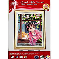 Tranh thêu kín cô gái và mèo bên cửa vs8844, kích thước 50 x 67cm, 11ct thêu 3 sợi