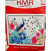 Tranh thêu kín đồng hồ chim công Km040, kích thước 65 x 50 cm