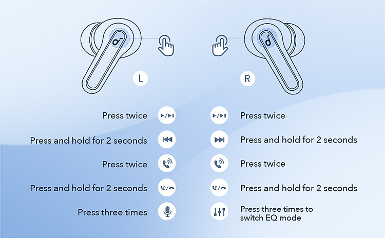 | Một bước để ghép nối Khi bạn mở hộp sạc, tai nghe ngay lập tức vào chề độ ghép nối. | Bluetooth 5.2 Trang bị công nghệ Bluetooth cho kết nối ổn định. | Chế độ độc lập Đôi khi, bạn chỉ cần nghe một bên tai nghe. Chỉ cần tháo một chiếc ra khỏi hộp sạc, đóng nắp và bắt đầu nghe. |