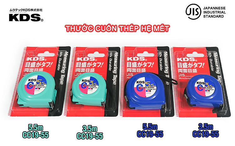 - Thước cuộn thép KDS CC có phần lưỡi thước dài, đủ để đáp ứng nhu cầu đo đạc từ đơn giản đến chuyên nghiệp. Có 2 kích thước cho bạn lựa chọn là 3.5m (CC16-35) và 5.5m (CC19-55).