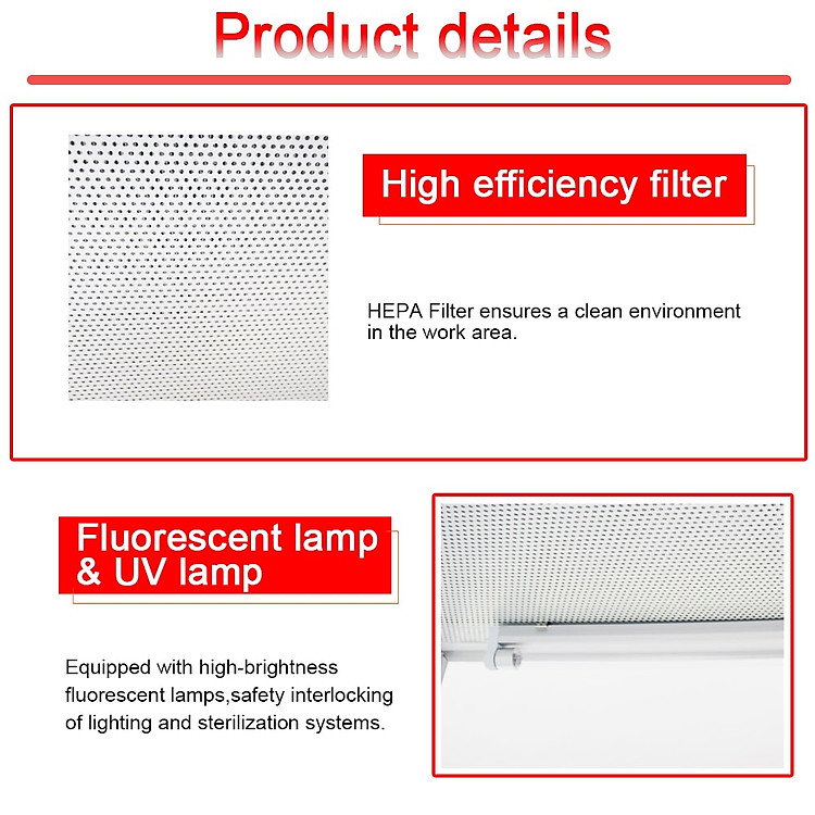 - Tủ sử dụng màng lọc HEPA với độ sạch Class 100@≥0.5μM (US Federal 209E). Với thử nghiệm số lượng khuẩn ≤0.5pcs/dish·hour (đĩa pettri Φ90mm).