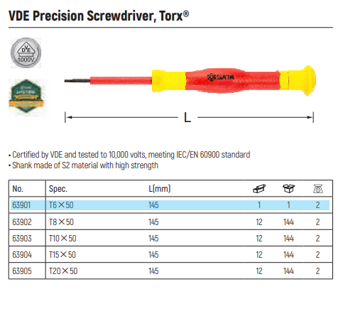 Giới thiệu Tua vít nhỏ chính xác T6 * 50mm cách điện 1000V VDE SATA 63901
