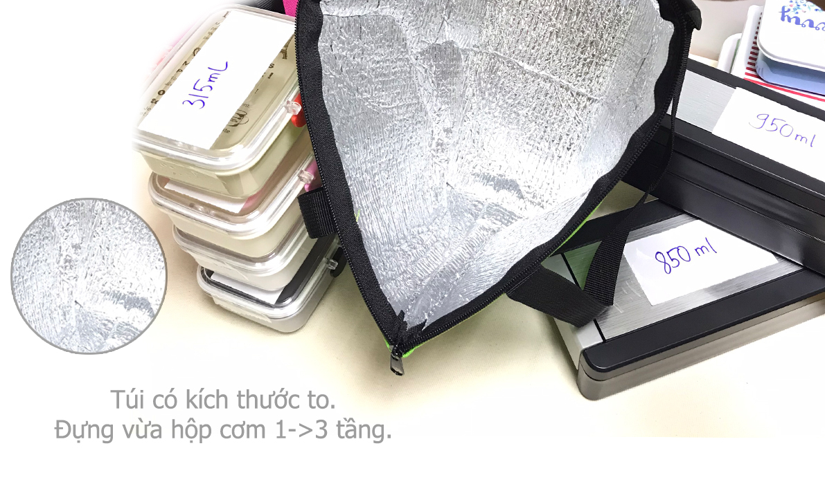 Hình ảnh cho thấy túi khá lớn, đựng vừa hộp 850ml và vẫn còn dư đủ để bỏ thêm hôp cơm 950ml và Hộp canh 315ml