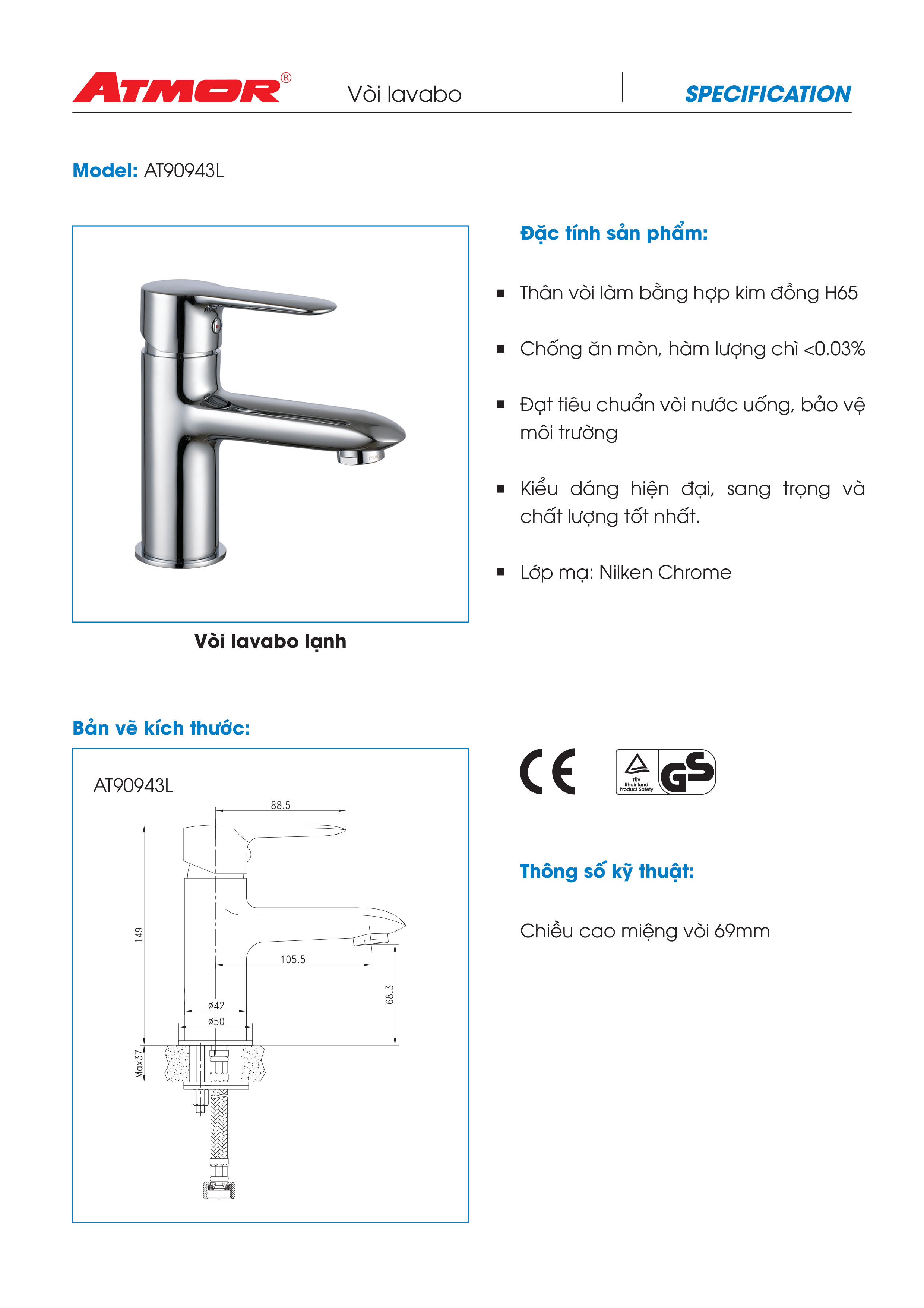 | Kích thước (Dài x Rộng x Cao) | Chiều cao miệng vòi 72mm |
